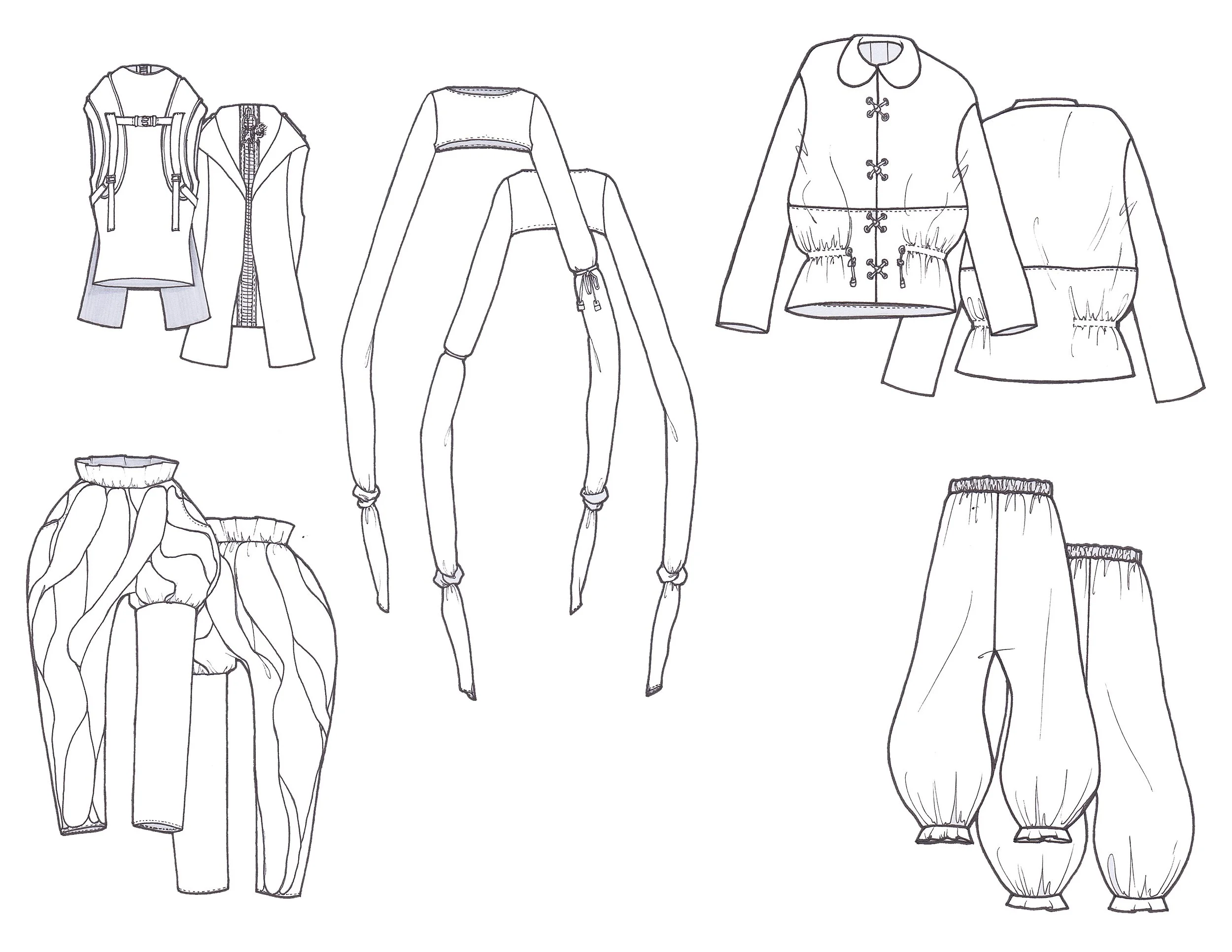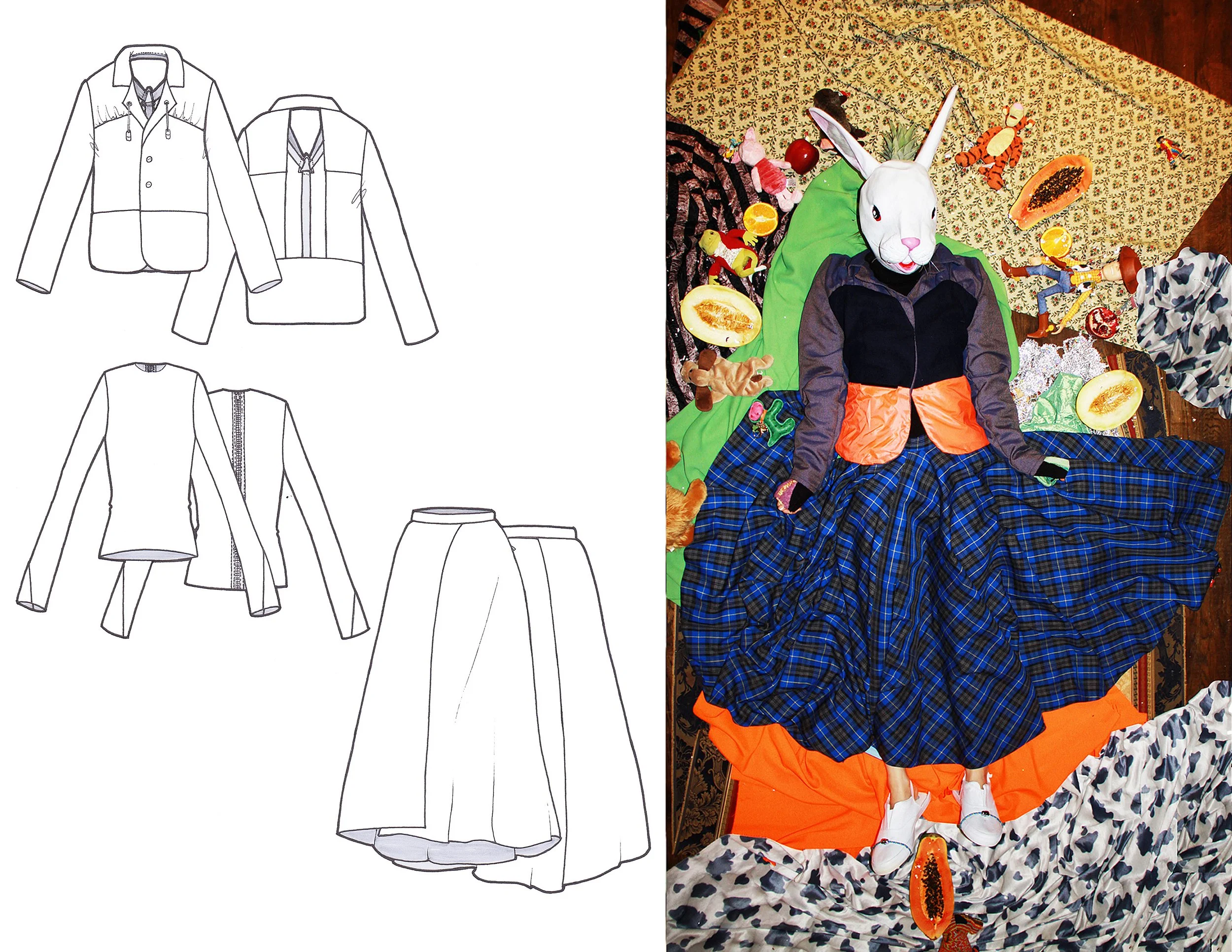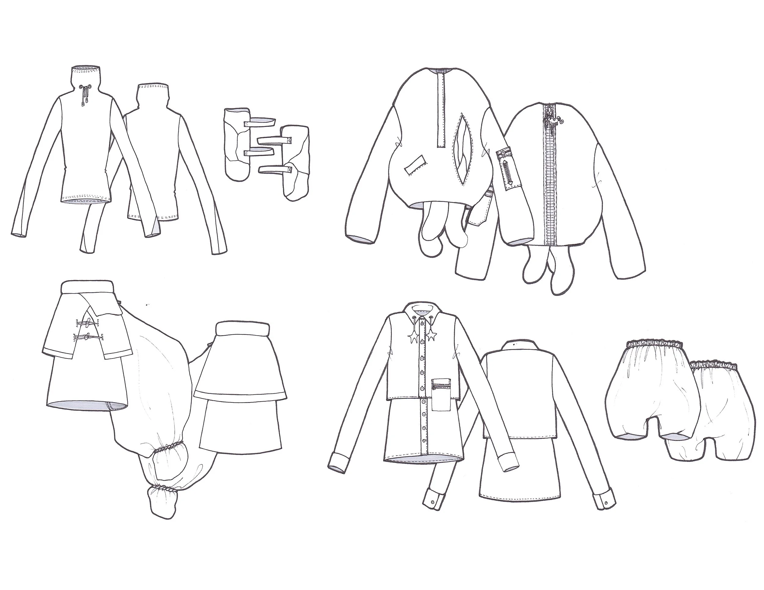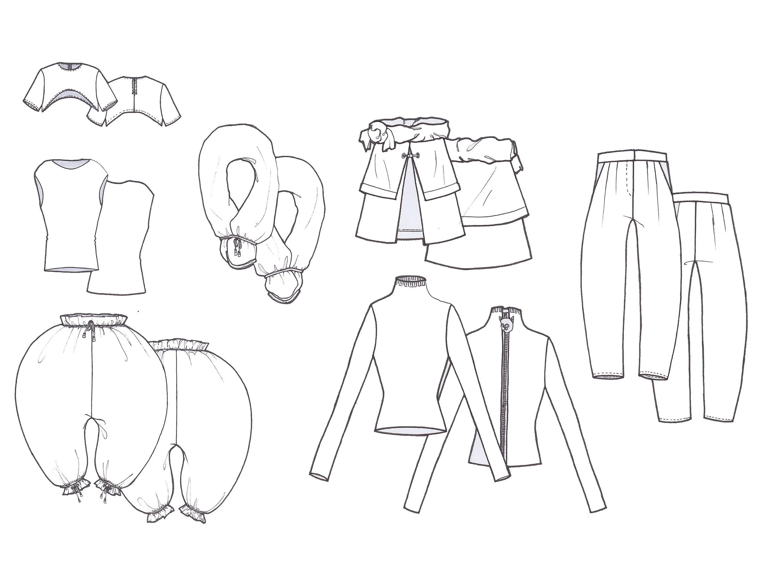 Fashion collection with various fabric manipulation techniques, embellishments, pocket details, draping, cut and sew.
